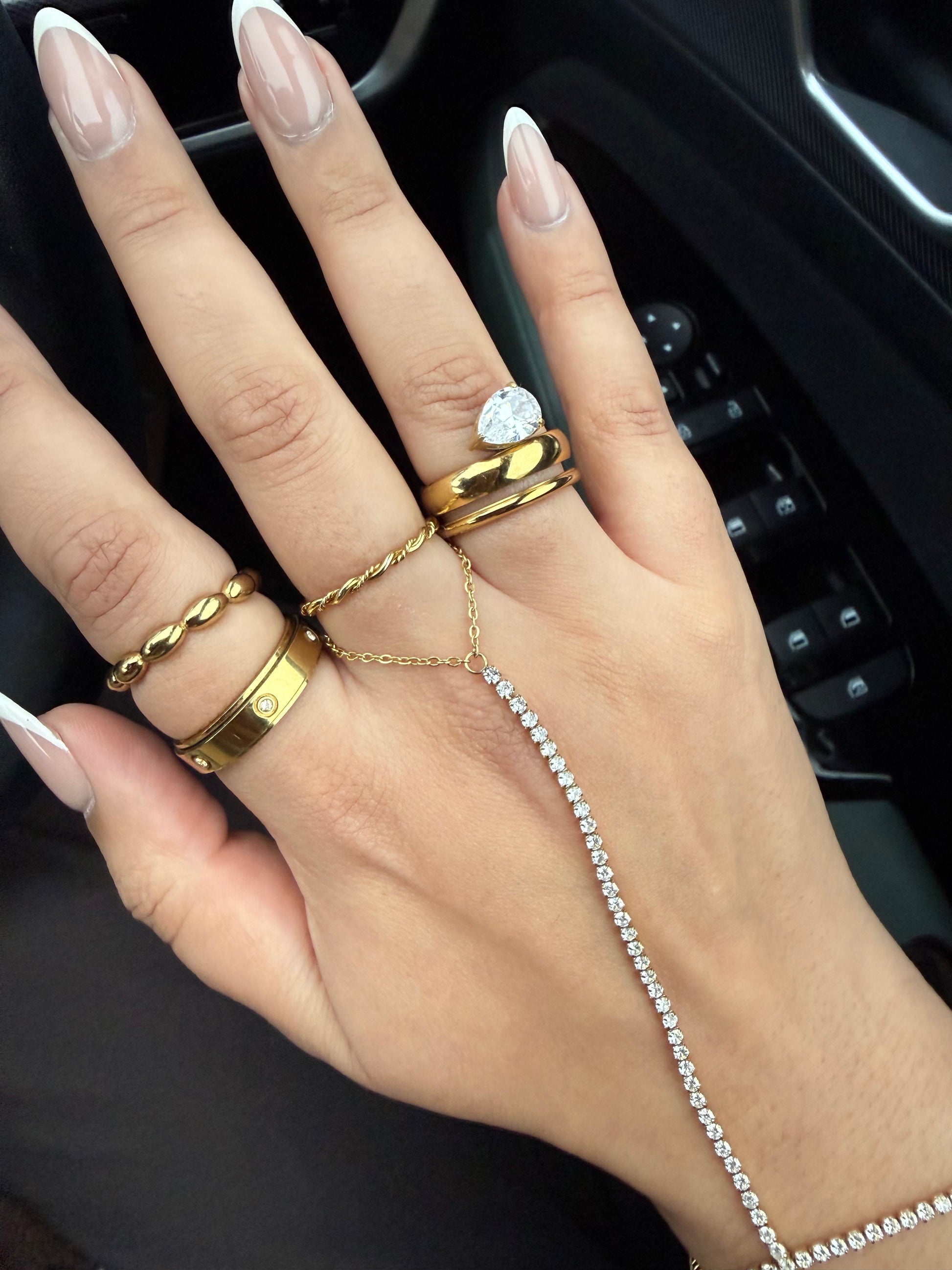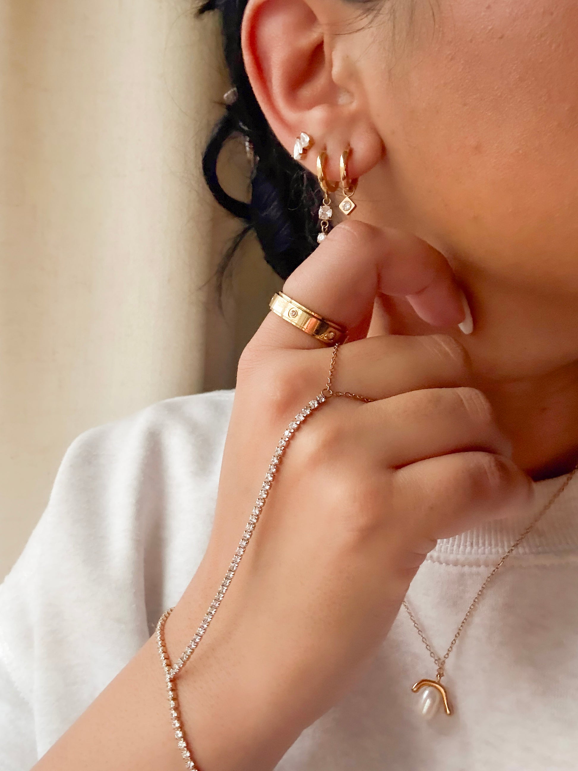 Delicate yet show-stopping, this hand chain features a full line of shimmering cubic zirconia stones that catch the light with every movement. It’s the kind of piece that instantly elevates your look, whether you’re dressed up for a celebration or simply want your everyday outfit to feel a little extra.
