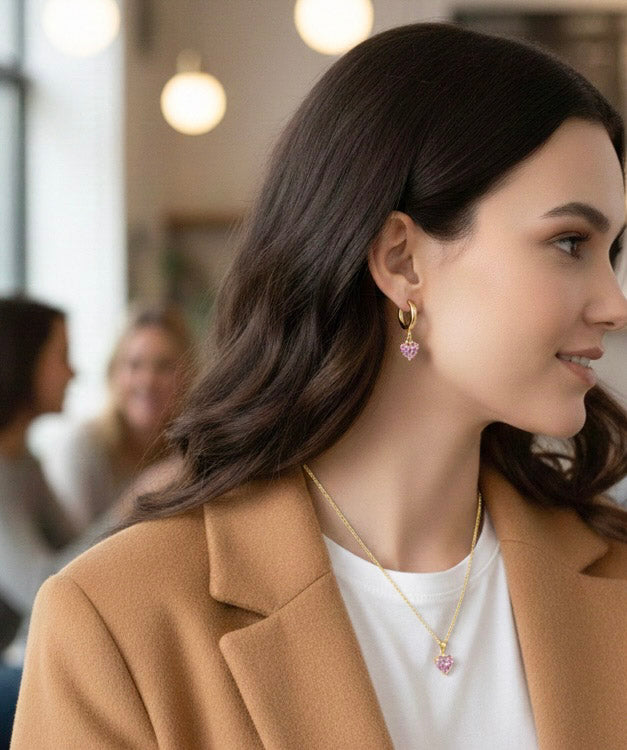 Featuring a blush pink heart-cut cubic zirconia, this piece symbolises warmth, care, and quiet confidence. Designed to sit effortlessly at the collarbone, it brings a soft glow to everyday moments — whether worn alone or layered with your favourites.