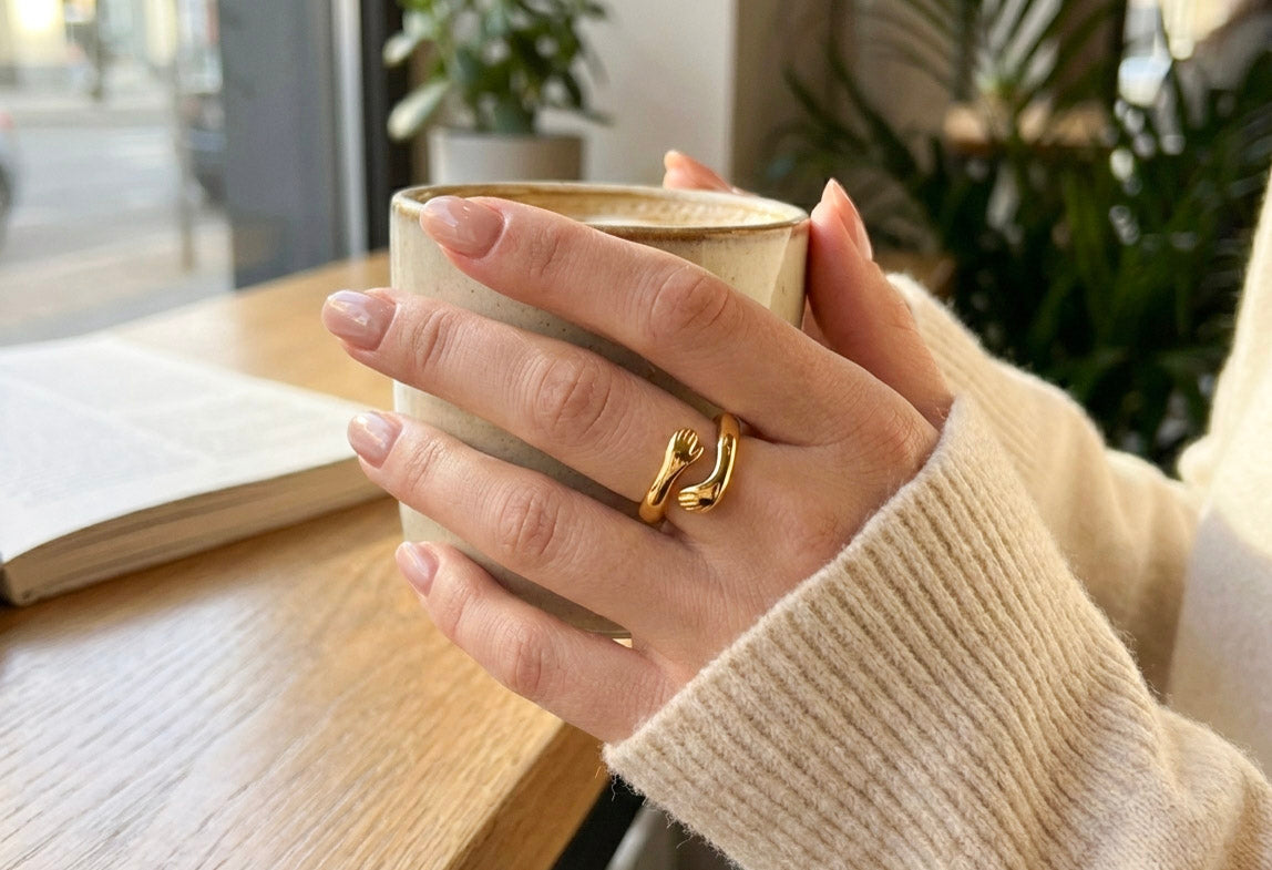 Designed with two sculpted hands gently wrapping around the finger, this piece symbolises comfort, protection and connection whether that’s love from someone else or the strength you give yourself.