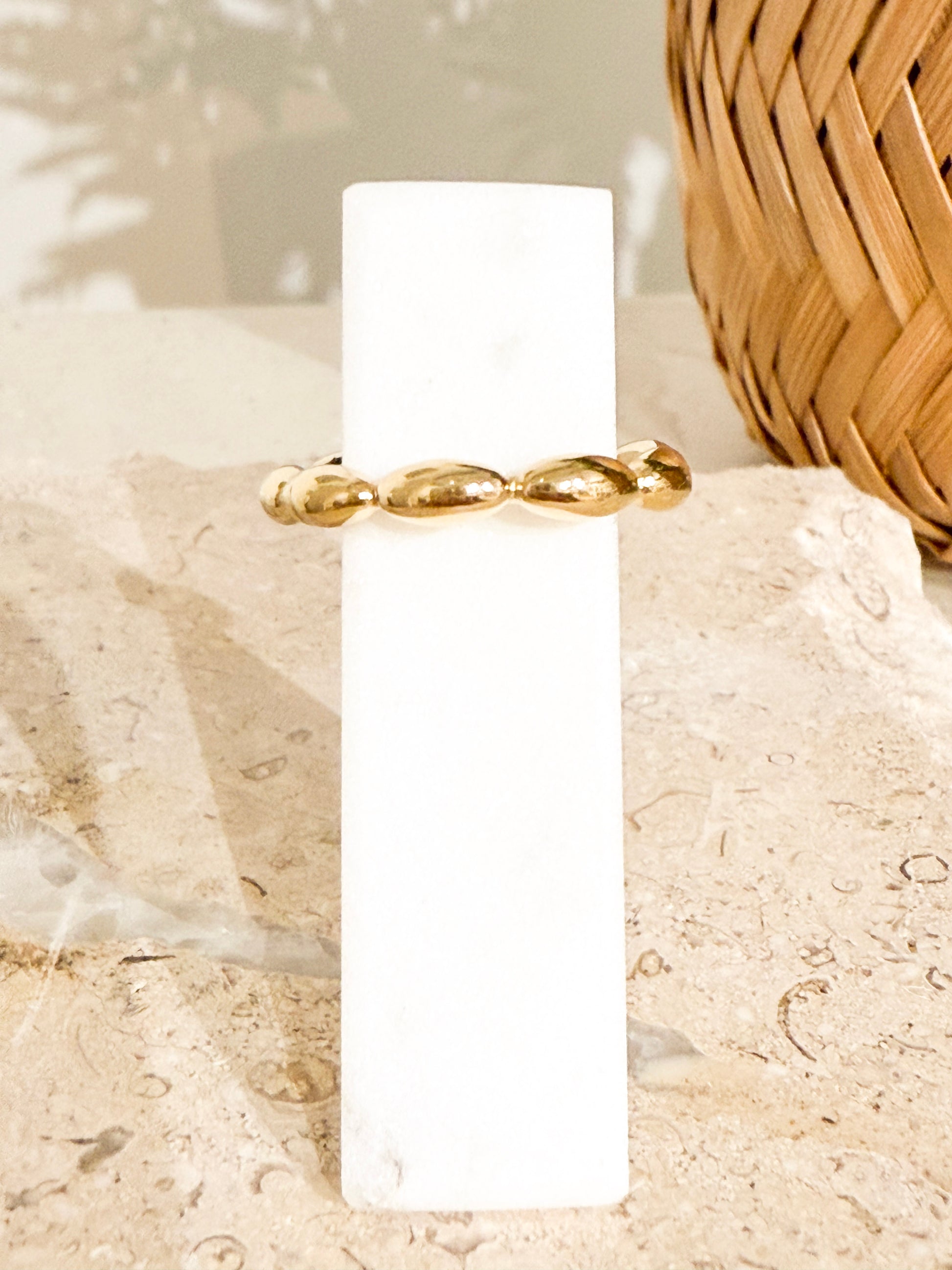 Crafted from 18k gold-plated stainless steel, the band features rounded, pebble-like shapes that catch the light beautifully while adding subtle texture to your stack.