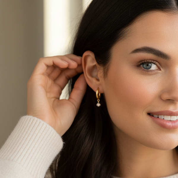These classic gold huggies are finished with a delicate stone drop that catches the light as you move. They’re not loud — but they’re impossible to miss.