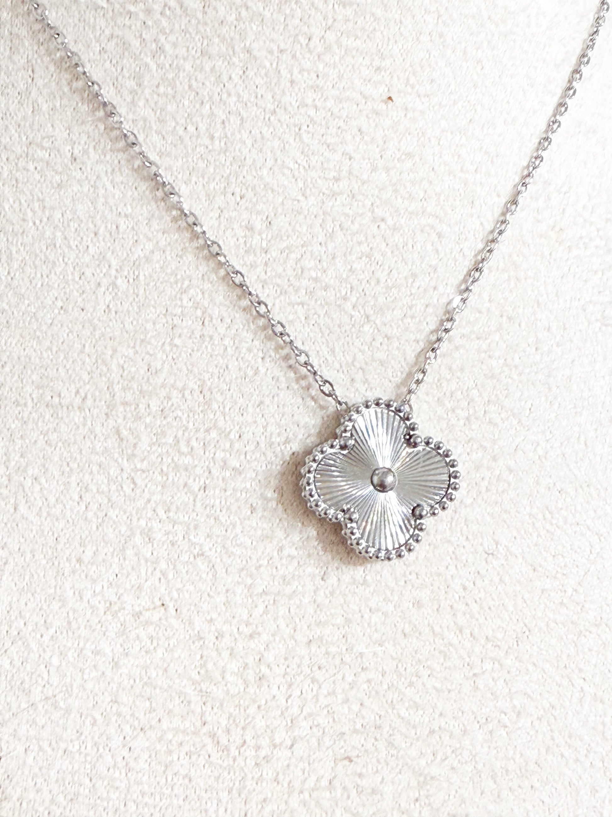 Crafted from stainless steel with a radiant silver finish, this necklace features a beautifully detailed clover pendant — a symbol of luck, love, and positivity. The textured design adds depth and shine, making it eye-catching whether worn solo or layered with other necklaces.