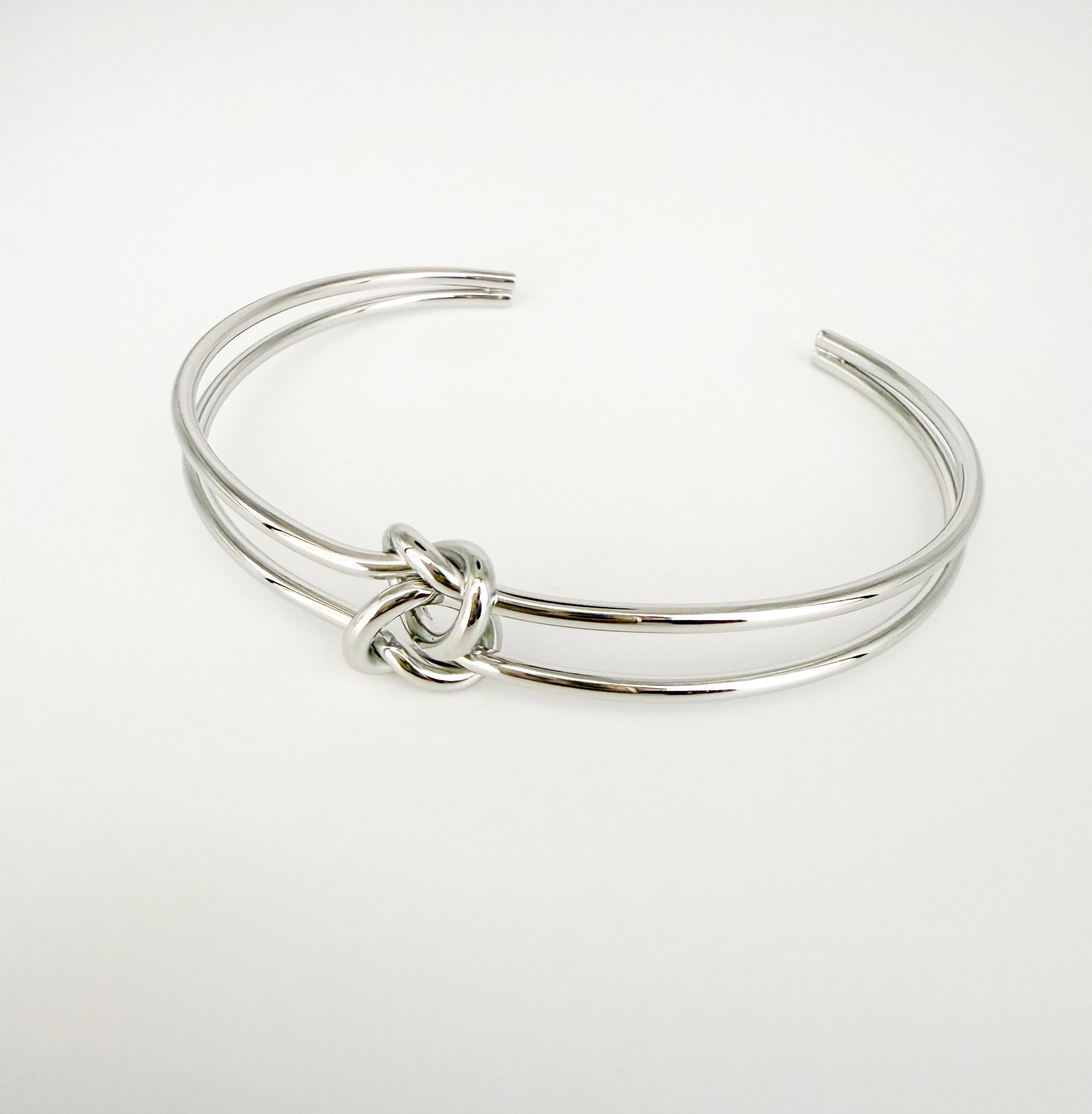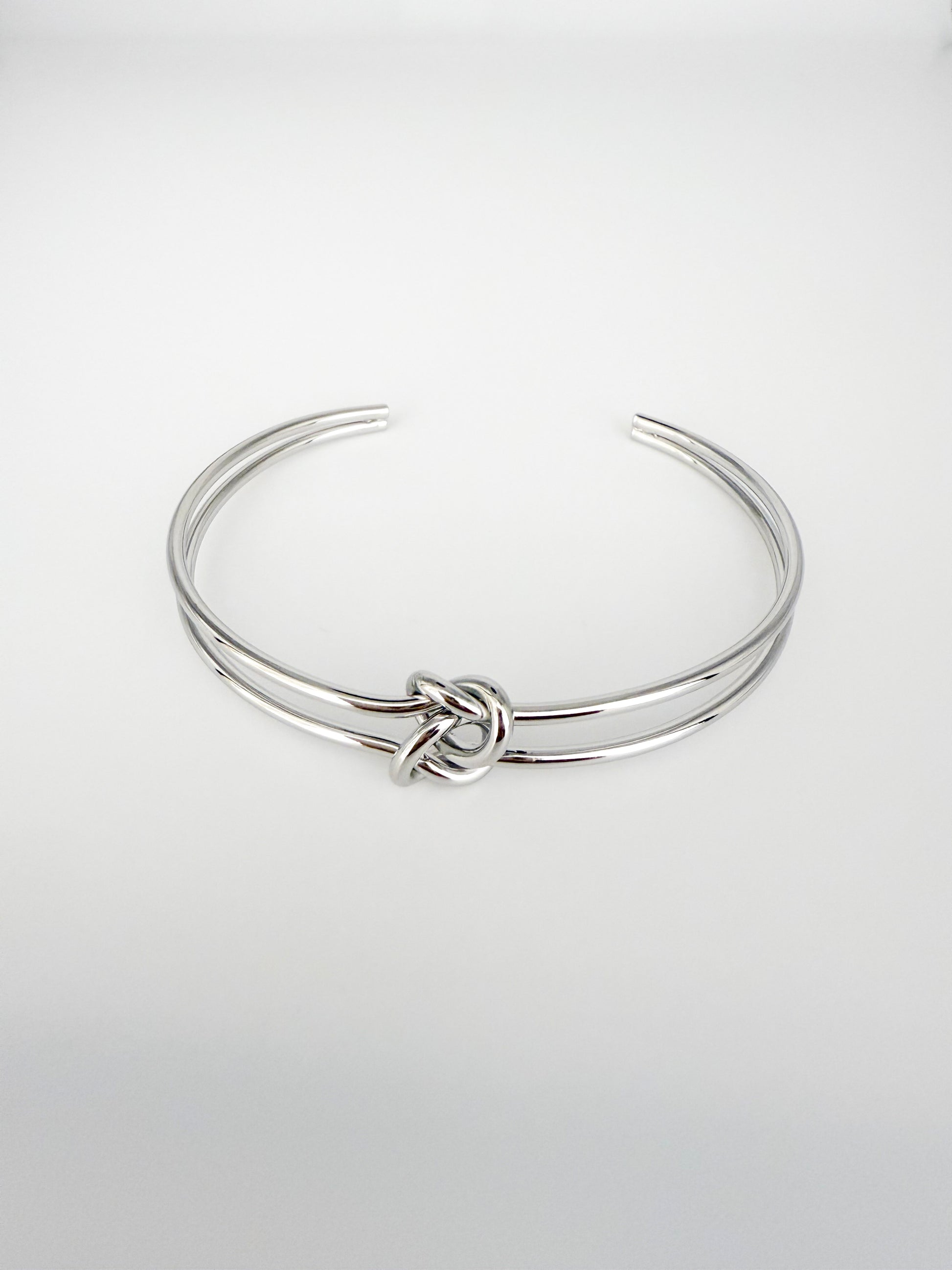The Silver Double Knot Cuff blends minimal design with meaningful detail. Featuring two sleek silver bands joined by a polished double knot, this piece symbolises strength, connection and unbreakable bonds — all in a chic, understated way.