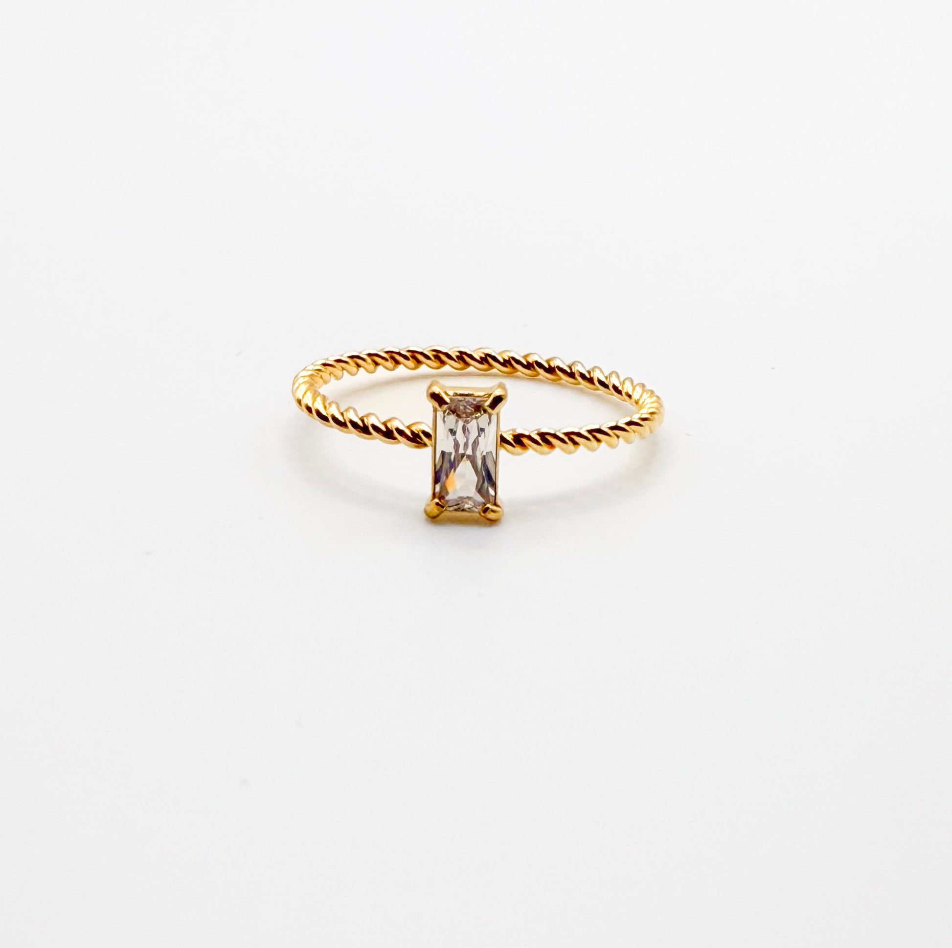 The Twisted Solitaire Ring features a sleek rectangular cubic zirconia gem set on a beautifully twisted 18k gold-plated band, giving you a refined sparkle perfect for every day and every occasion.