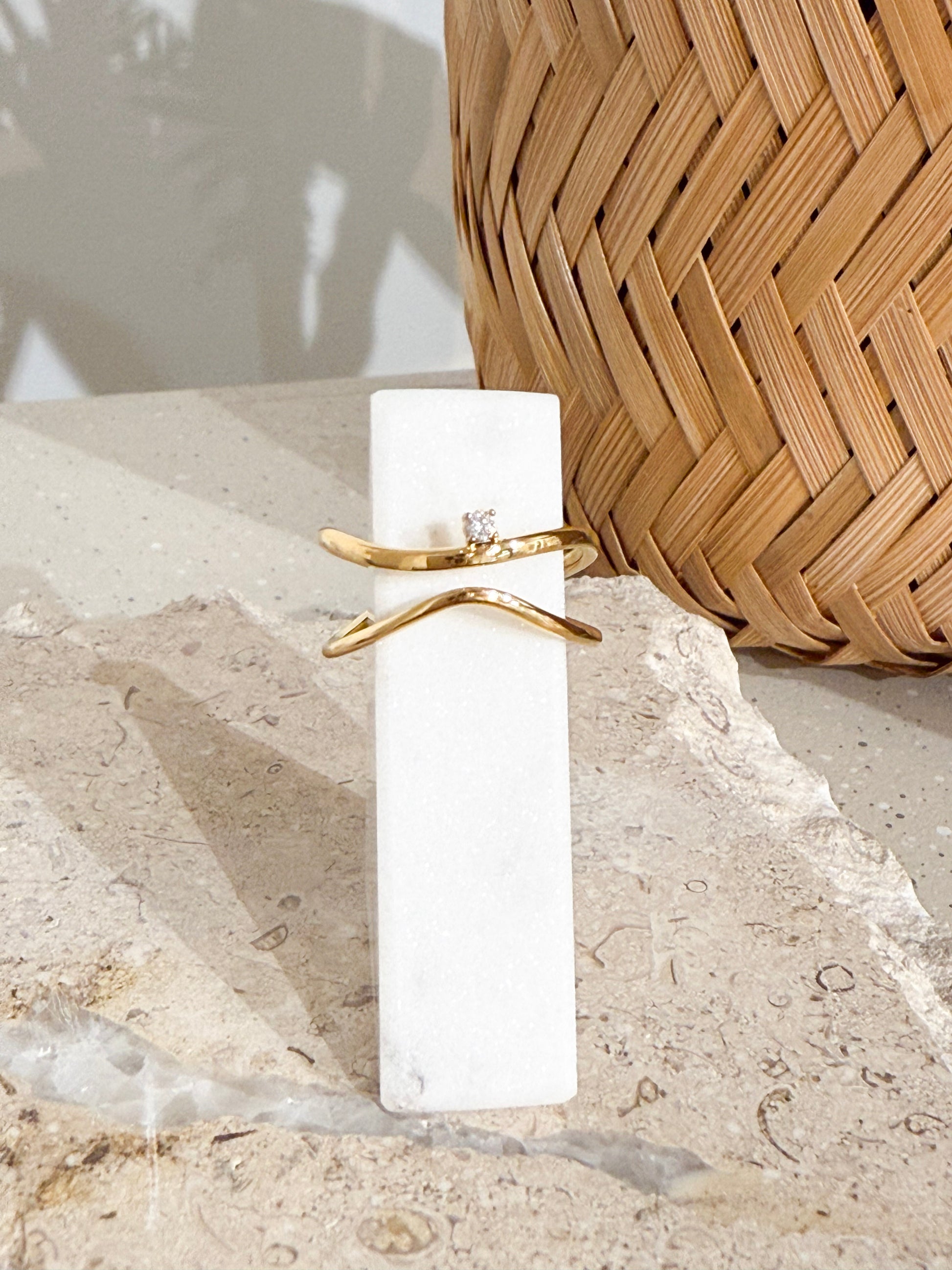 Crafted from 18k gold-plated stainless steel, this ring features a sleek wave-inspired band with a single sparkling cubic zirconia stone at the centre, catching the light beautifully with every move.